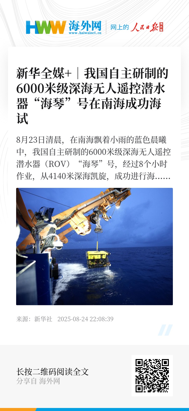 8月23日清晨,在南海飘着小雨的蓝色晨曦中,我国自主研制的6000米级深海无人遥控潜水器(ROV)“海琴”号,经过8个小时作业,从4140米深海凯旋,成功进行海试,我国深海研究又多了一个“科考利器”。