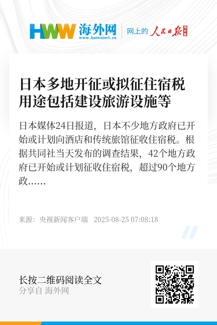 日本媒体24日报道,日本不少地方政府已开始或计划向酒店和传统旅馆征收住宿税。
