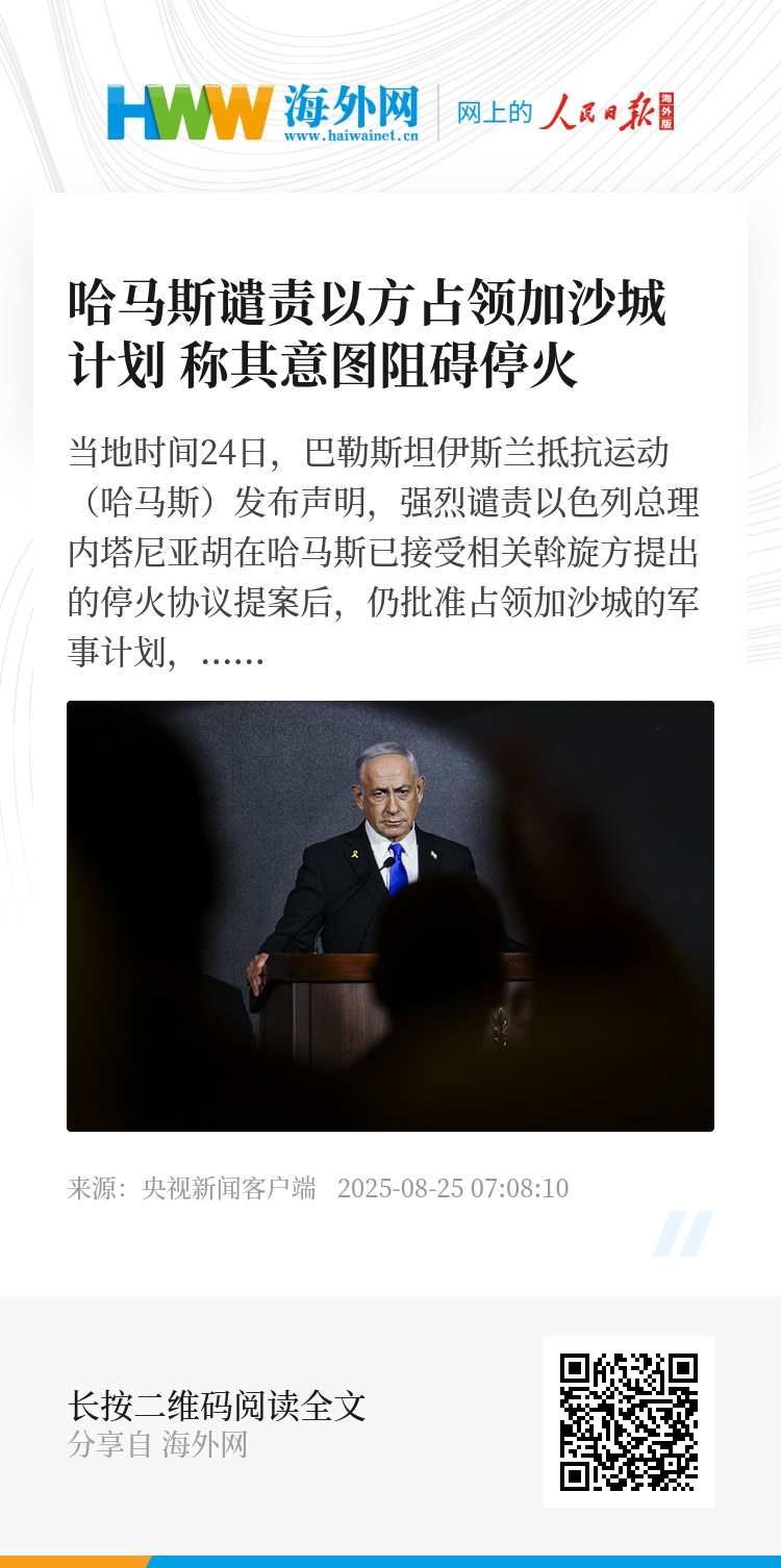 当地时间24日,巴勒斯坦伊斯兰抵抗运动(哈马斯)发布声明,强烈谴责以色列总理内塔尼亚胡在哈马斯已接受相关斡旋方提出的停火协议提案后,仍批准占领加沙城的军事计划,显示其蓄意阻挠协议达成。