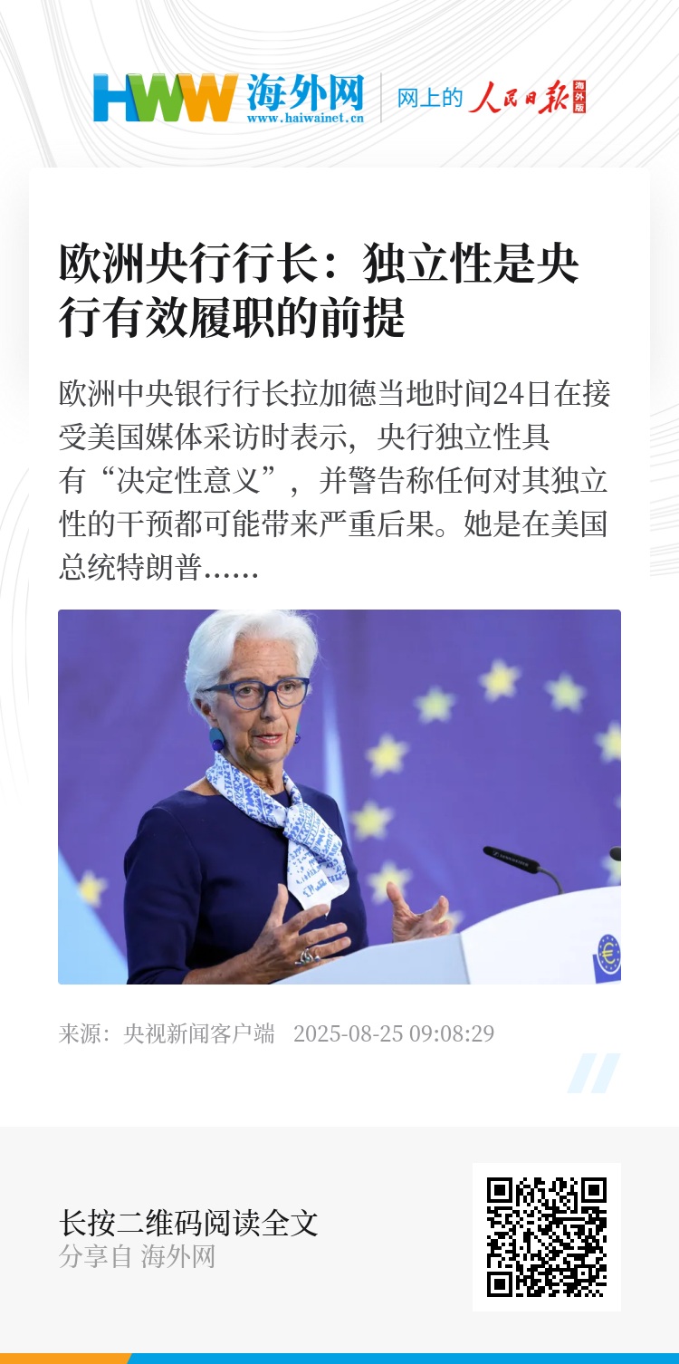 欧洲中央银行行长拉加德当地时间24日在接受美国媒体采访时表示,央行独立性具有“决定性意义”,并警告称任何对其独立性的干预都可能带来严重后果。她是在美国总统特朗普近期多次施压美联储的背景下作出的上述表态。