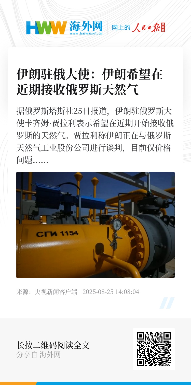 据俄罗斯塔斯社25日报道,伊朗驻俄罗斯大使卡齐姆·贾拉利表示希望在近期开始接收俄罗斯的天然气。贾拉利称伊朗正在与俄罗斯天然气工业股份公司进行谈判,目前仅价格问题未达成共识。