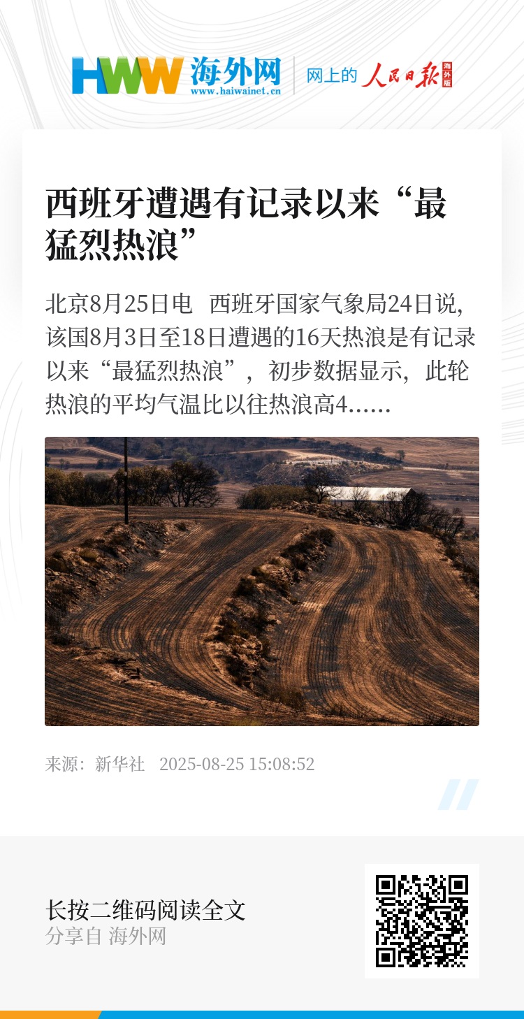 新华社北京8月25日电 西班牙国家气象局24日说,该国8月3日至18日遭遇的16天热浪是有记录以来“最猛烈热浪”,初步数据显示,此轮热浪的平均气温比以往热浪高4.6摄氏度,刷新了2022年7月创下的纪录。