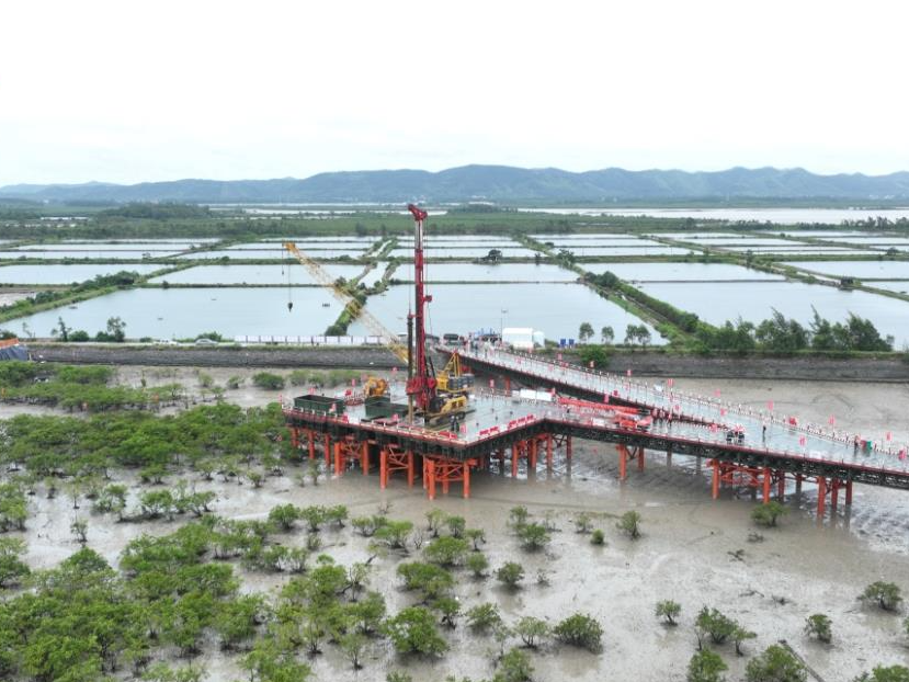 位于广西北海市合浦县境内的铁山港跨海特大桥全长8473.478米,共需施工桩基4332根、桥墩578个、现浇梁及简支箱梁共542跨。其中,海上桥墩99座、海上桩基919根,是合湛高铁全线重点控制性工程,也是目前广西最长的跨海铁路桥梁。施工过程中需要克服潮汐落差大、高盐雾侵蚀、台风强度大等影响,难度较大。