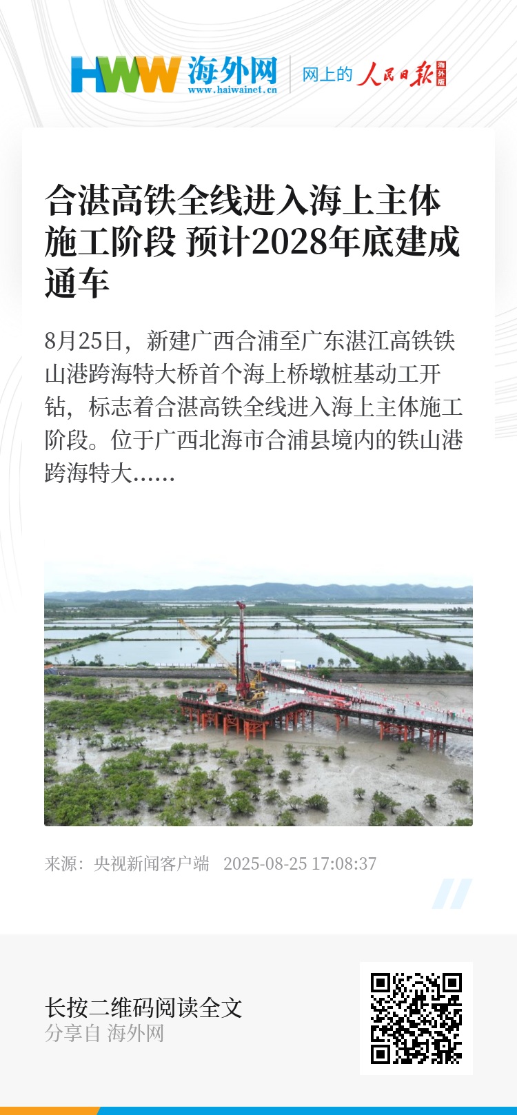 8月25日,新建广西合浦至广东湛江高铁铁山港跨海特大桥首个海上桥墩桩基动工开钻,标志着合湛高铁全线进入海上主体施工阶段。