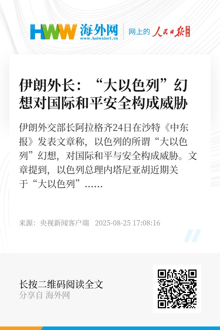 伊朗外交部长阿拉格齐24日在沙特《中东报》发表文章称,以色列的所谓“大以色列”幻想,对国际和平与安全构成威胁。文章提到,以色列总理内塔尼亚胡近期关于“大以色列”的言论,显示了他侵犯地区独立国家的国家主权、领土完整和安全的政治战略。阿拉格齐警告,犹豫或疏忽将给伊斯兰世界带来毁灭性代价。伊斯兰世界必须采取果断行动,加强协调合作,拯救加沙地带民众并保卫伊斯兰世界。