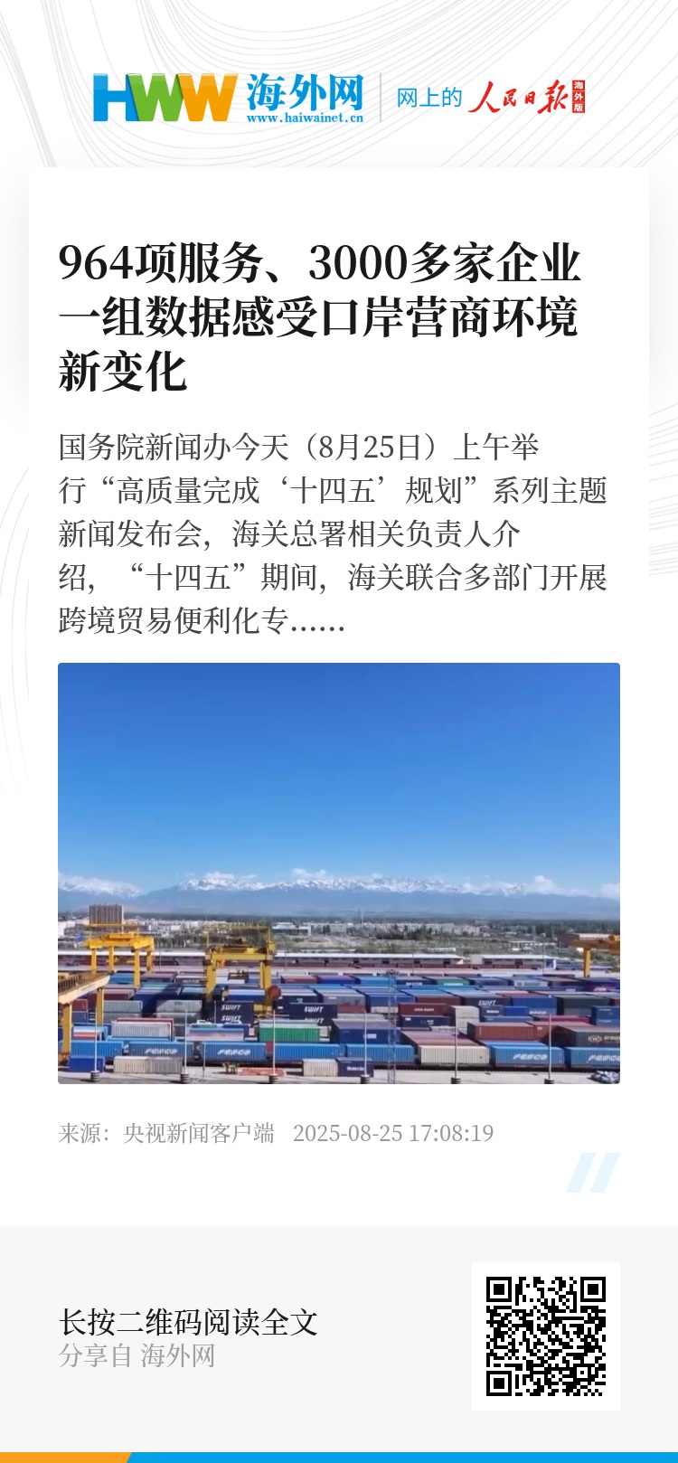 国务院新闻办今天(8月25日)上午举行“高质量完成‘十四五’规划”系列主题新闻发布会,海关总署相关负责人介绍,“十四五”期间,海关联合多部门开展跨境贸易便利化专项行动,口岸营商环境取得明显成效。