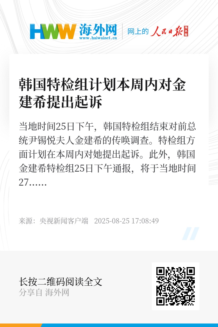 此外,韩国金建希特检组25日下午通报,将于当地时间27日上午10时再次对金建希进行传唤调查。