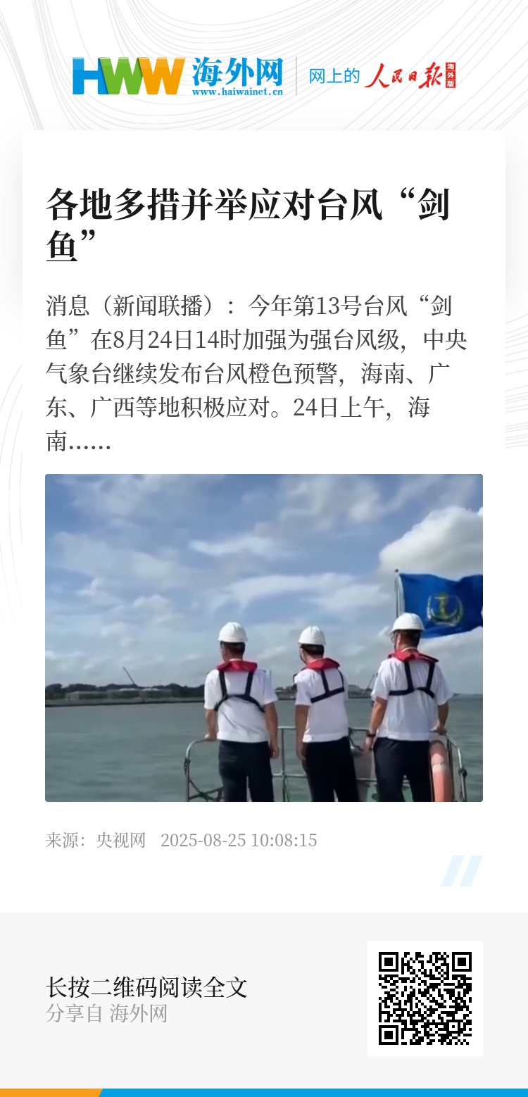 央视网消息(新闻联播):今年第13号台风“剑鱼”在8月24日14时加强为强台风级,中央气象台继续发布台风橙色预警,海南、广东、广西等地积极应对。
