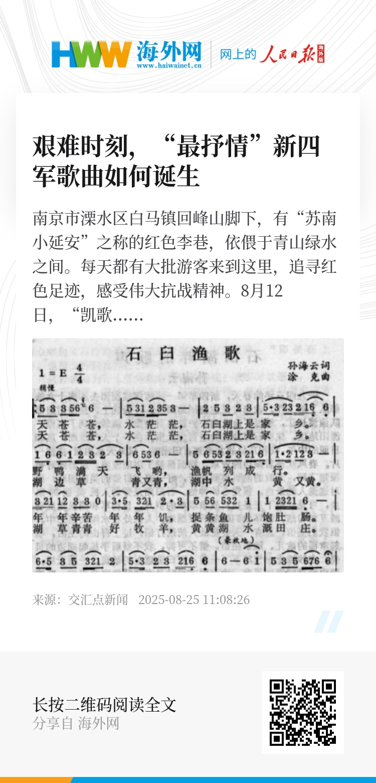8月12日,“凯歌穿越八十年”寻访团走进红色李巷。村中一方池塘边静静矗立的一块刻有《石臼渔歌》简谱的石碑,吸引大家的目光。在艰苦卓绝的敌后抗战岁月,新四军文艺工作者创作了大量反映部队战斗、根据地建设的歌曲,《石臼渔歌》就是其中一首。这首歌曲以温暖而有力的方式,抚慰人心、凝聚信念,让人们在歌声中找到希望的光芒。它是如何诞生的?为何能在烽火年代被广为传唱?