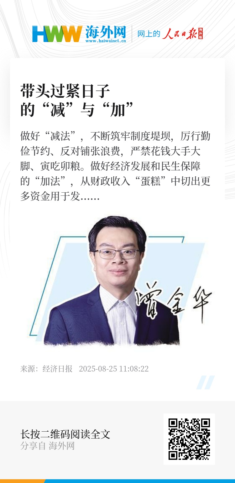 足国之道,节用裕民。做好党政机关带头过紧日子的“加减法”,减的是铺张浪费、大手大脚,加的是民生福祉、发展动能,实现以紧日子换取好日子,这也是过紧日子的最终目的。(本文来源:经济日报 作者:曾金华)