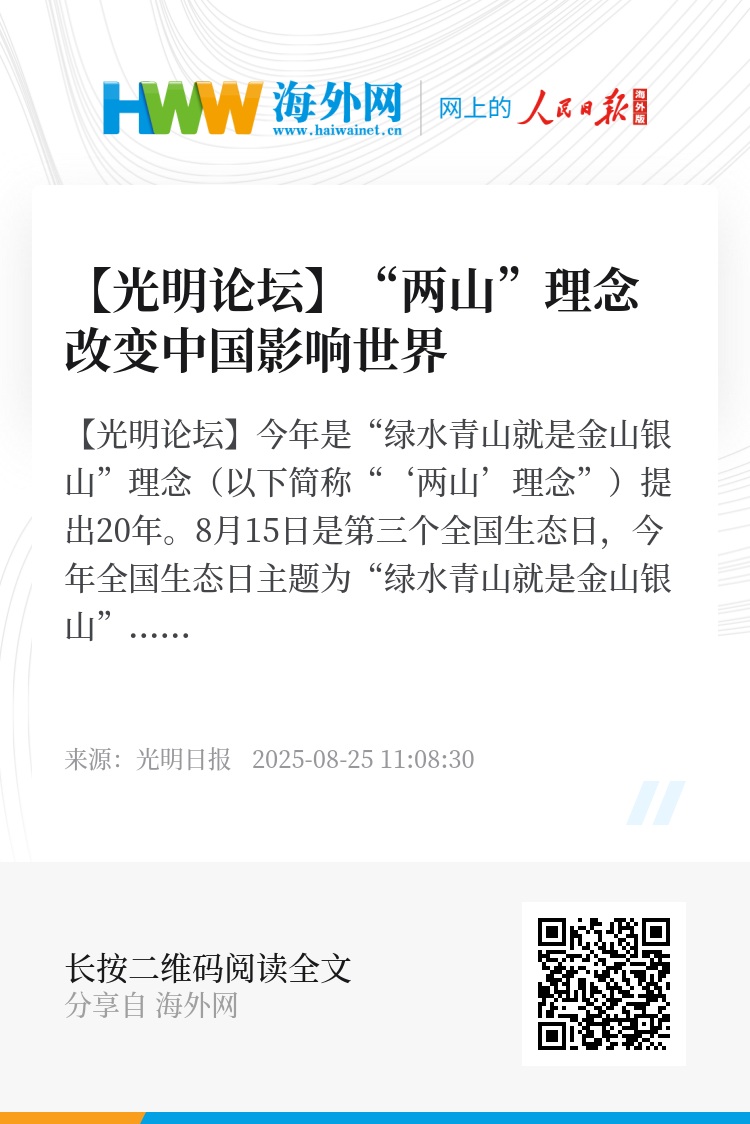 站在20年的时空坐标回望,“两山”理念的实践伟力已清晰可见。它不仅让中国走出了一条生态优先、绿色发展的新路,更重要的是构建了一种新的文明认知——人类不是自然的统治者,而是地球生命共同体的有机组成部分,这为全球生态治理提供了新的思路和方向。
