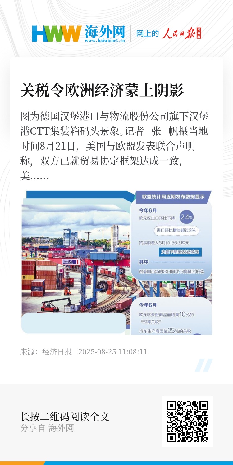 当地时间8月21日,美国与欧盟发表联合声明称,双方已就贸易协定框架达成一致,美国在声明中重申了对欧盟大部分商品征收15%的关税上限,涵盖汽车、药品、半导体芯片和木材等。美欧向着正式确立贸易协定又迈出一步,此前一段时间美国对欧盟实施的高关税对欧洲出口商们已经造成了不小的打击。欧盟统计局近期发布数据显示,今年6月欧元区出口整体下滑,对美出口更是同比骤降超10%。专家提醒,高关税叠加汇率波动和全球需求疲软,可能在接下来几个季度持续拖累欧洲出口,令欧洲经济蒙上阴影。