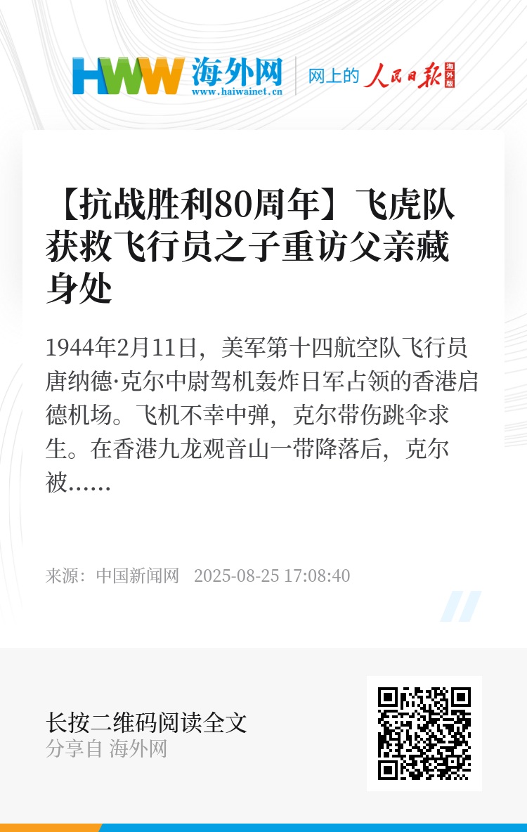 1944年2月11日,美军第十四航空队飞行员唐纳德·克尔中尉驾机轰炸日军占领的香港启德机场。飞机不幸中弹,克尔带伤跳伞求生。在香港九龙观音山一带降落后,克尔被中国游击队员所救,藏身于山上的一处山洞。这期间,他获得了来自中国游击队的许多帮助。81年后,克尔中尉的儿子戴维·克尔带着几位游击队后人、历史研究者、记者以及两位香港某国际学校的外籍教师,一起踏上了重访父亲获救路的旅程。他们翻山越岭,最终在克尔中尉当年藏身的山洞里,重新体悟了中国人民的抗战精神。(记者 温孟馨)