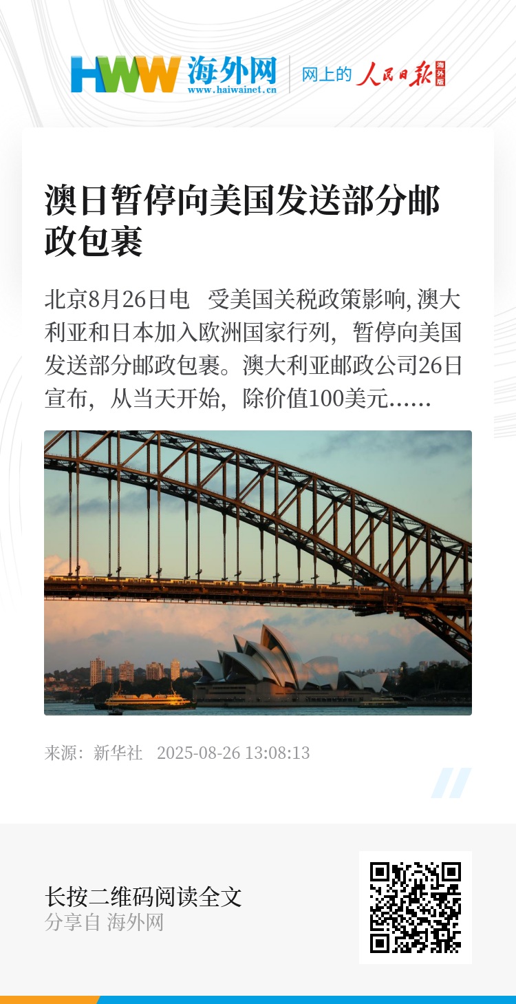 新华社北京8月26日电 受美国关税政策影响,澳大利亚和日本加入欧洲国家行列,暂停向美国发送部分邮政包裹。