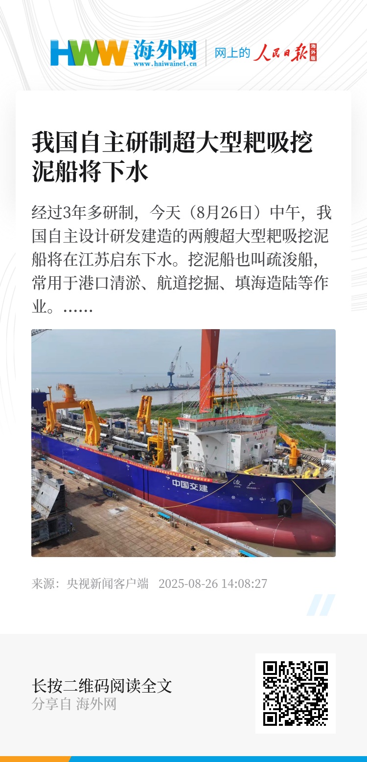 下水后还要进行疏浚机具、智控系统安装等工作,“通浚”轮和“浚广”轮计划于今年年底进行海试并交付使用。两船将广泛用于国内外港航疏浚、深远海取砂、吹填造陆、深海采矿、管沟开挖回填、碎石基床及深海管道铺设等场景。(总台央视记者 李伟代 黄成)