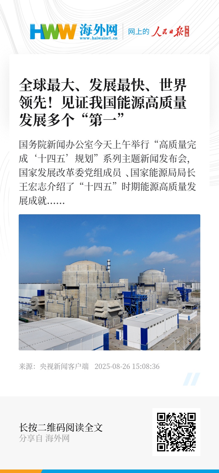 白鹤滩水电站、自主三代核电“华龙一号”“国和一号”、第四代高温气冷堆等多个“全球最大”“全球首座”工程建成投运,油气开发突破深地“万米大关”、挺进“千米深海”,这些“大国重器”彰显了我国科技创新的硬核实力。