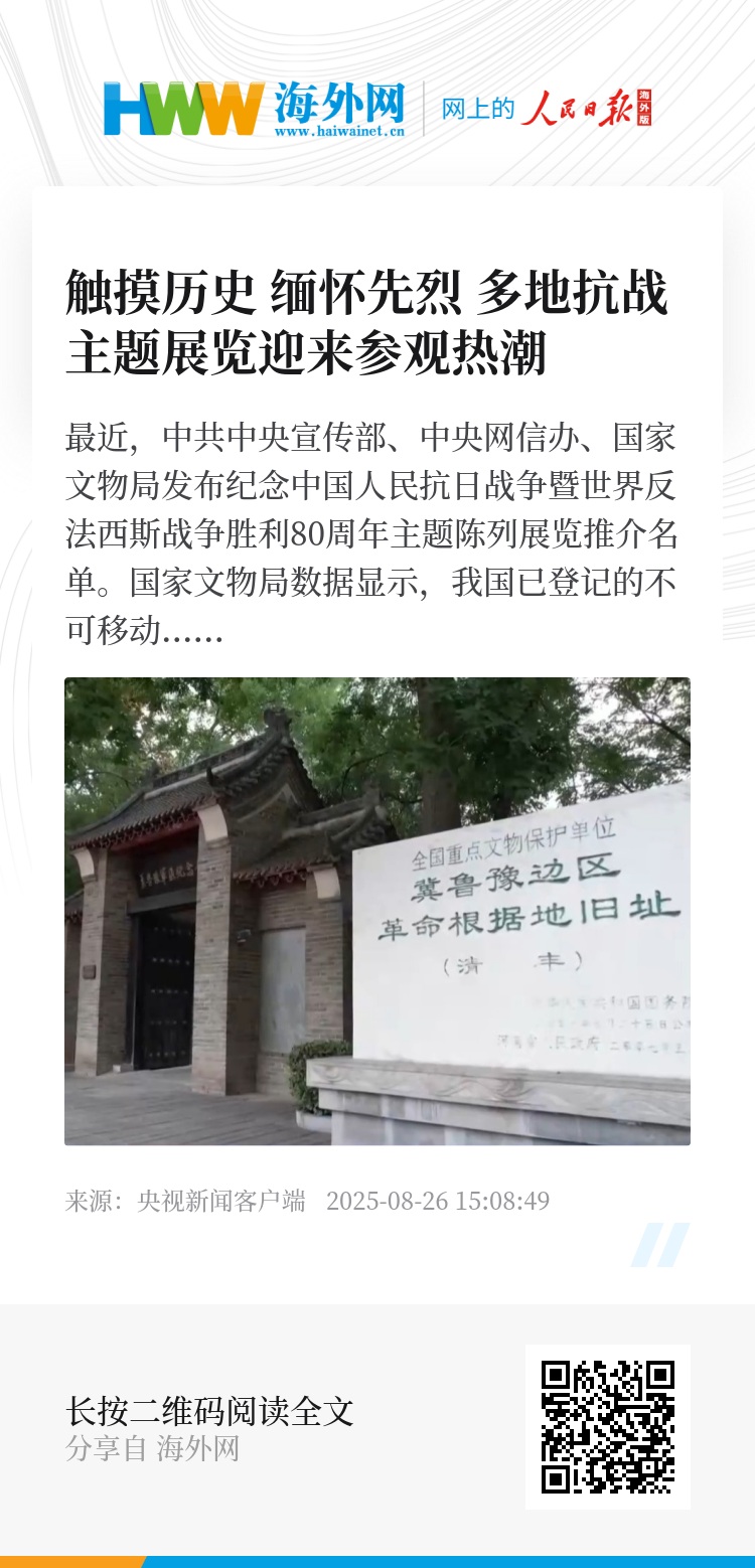 最近,中共中央宣传部、中央网信办、国家文物局发布纪念中国人民抗日战争暨世界反法西斯战争胜利80周年主题陈列展览推介名单。国家文物局数据显示,我国已登记的不可移动革命文物有3.6万余处,可移动革命文物有100多万件(套)。多地博物馆、纪念馆围绕抗战主题推出各具特色的陈列展览。