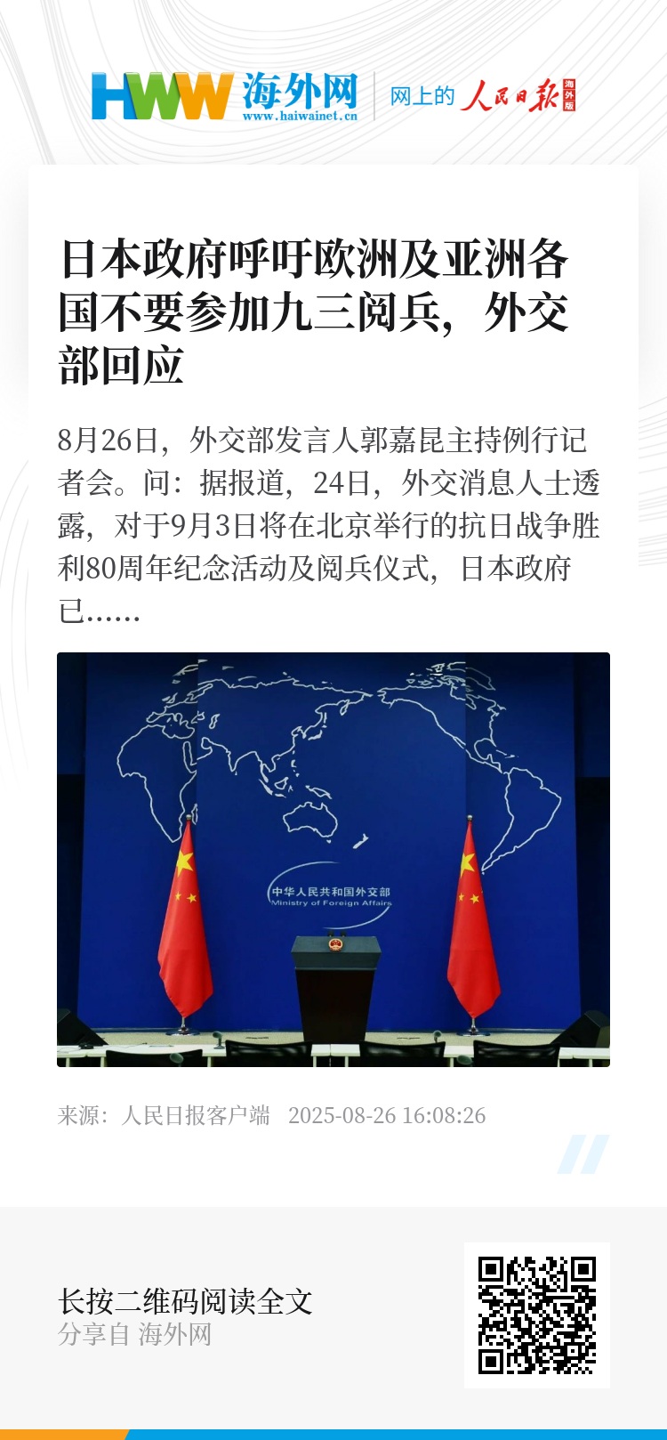 问:据报道,24日,外交消息人士透露,对于9月3日将在北京举行的抗日战争胜利80周年纪念活动及阅兵仪式,日本政府已通过外交渠道呼吁欧洲及亚洲各国不要参加。日本通过驻外大使馆等向各国称,此次中国的活动过度聚焦历史、反日色彩浓重,呼吁各国谨慎考虑。中方对此有何评论?