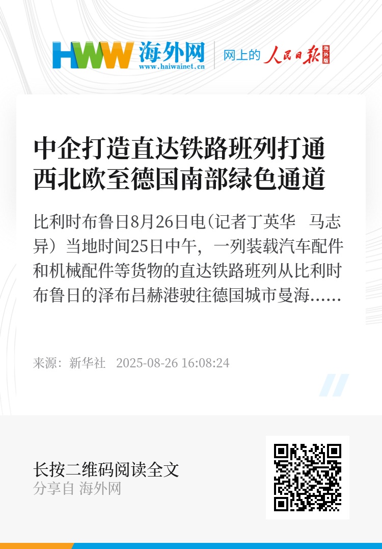 新华社比利时布鲁日8月26日电(记者丁英华 马志异)当地时间25日中午,一列装载汽车配件和机械配件等货物的直达铁路班列从比利时布鲁日的泽布吕赫港驶往德国城市曼海姆,标志着这条联动西北欧门户与德国南部工业腹地的绿色物流走廊正式打通。