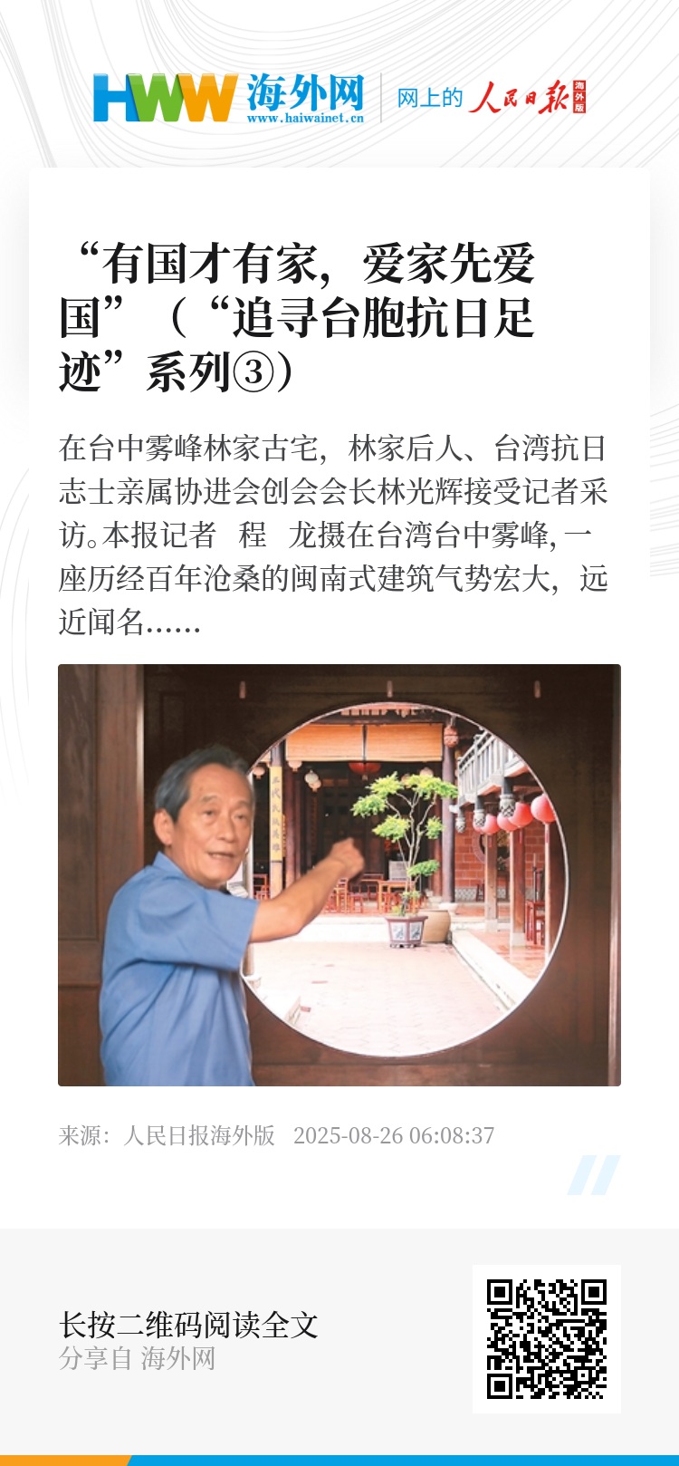 林家后人、台湾抗日志士亲属协进会理事长林铭聪表示,今年是抗战胜利80周年和台湾光复80周年,历史意义深远。“抗战胜利来之不易,是无数志士用热血换来的。我们要倍加珍惜如今的和平,也希望两岸携手,共同守护中华民族的和平与发展。”(本报记者 柴逸扉 程 龙)