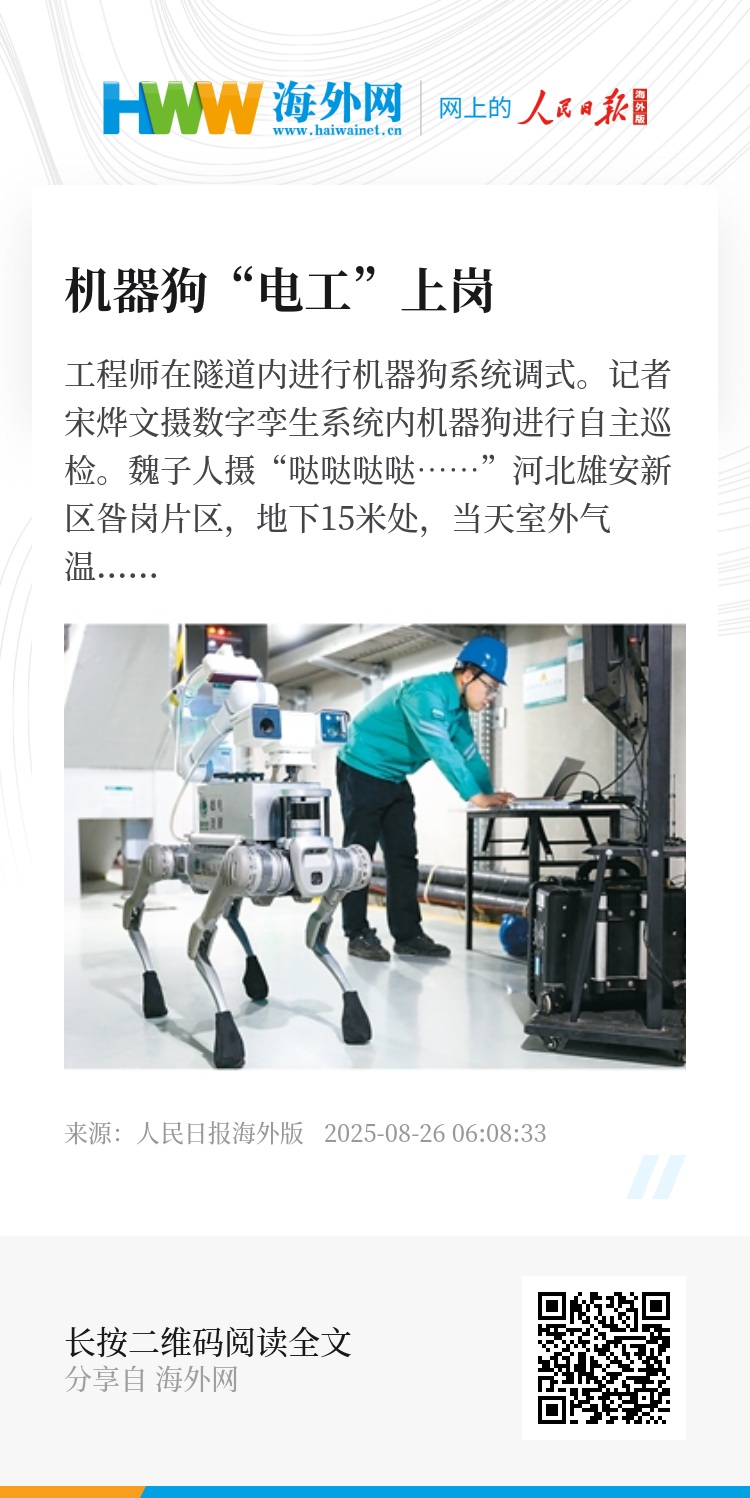 河北雄安新区昝岗片区,地下15米处,当天室外气温33摄氏度,但这里只有23摄氏度。这是一条长长的管廊,宽2.8米,高2.9米。一只机器狗正迈着有节奏的步子向远处行走。