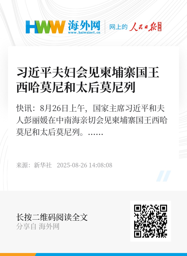 新华社快讯:8月26日上午,国家主席习近平和夫人彭丽媛在中南海亲切会见柬埔寨国王西哈莫尼和太后莫尼列。