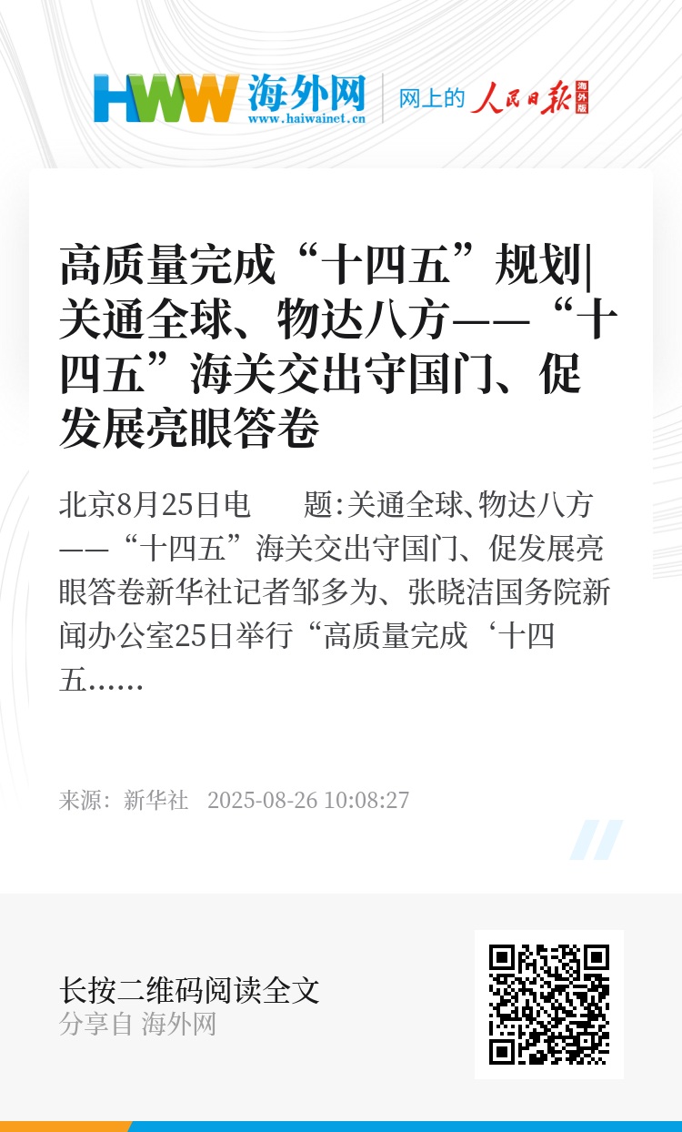 新华社北京8月25日电 题:关通全球、物达八方——“十四五”海关交出守国门、促发展亮眼答卷