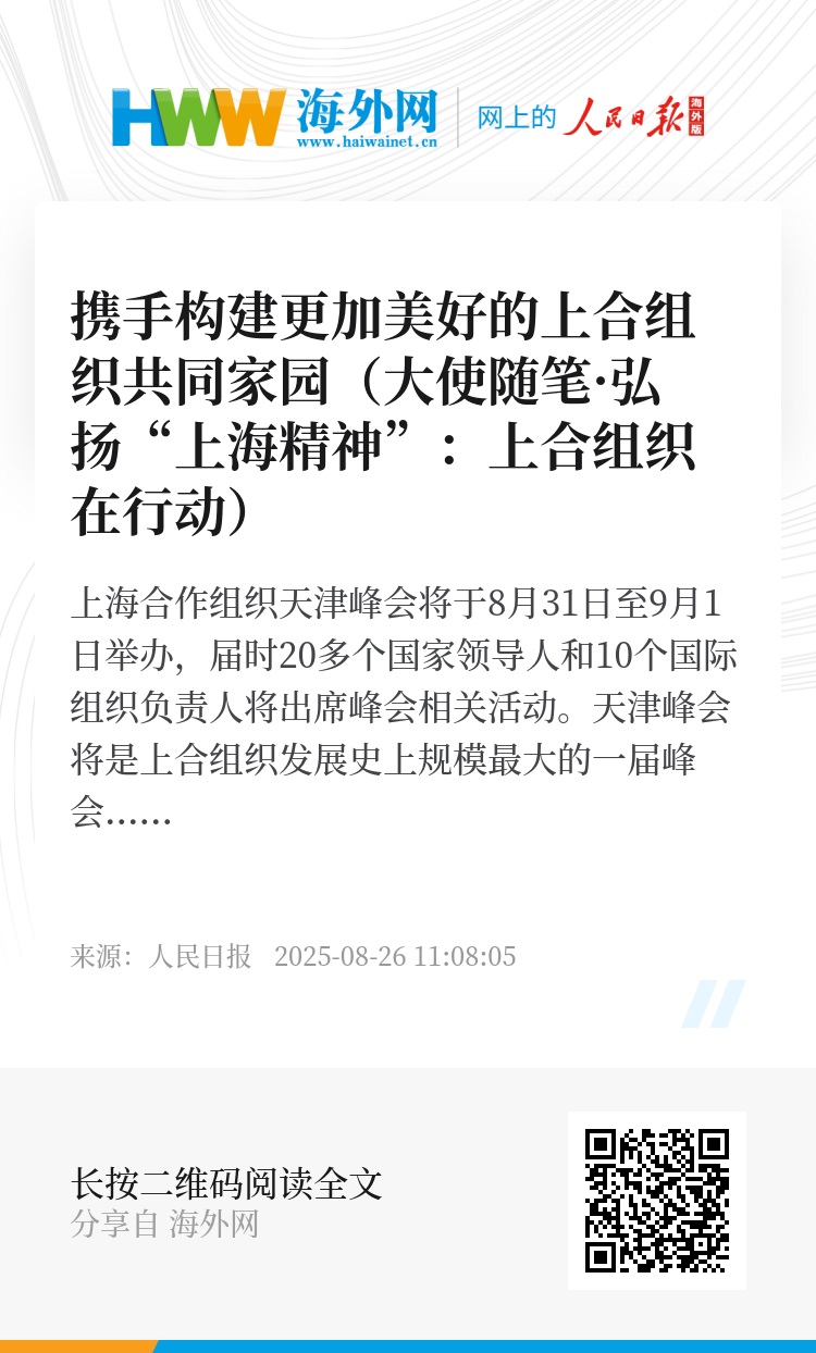 上海合作组织天津峰会将于8月31日至9月1日举办,届时20多个国家领导人和10个国际组织负责人将出席峰会相关活动。天津峰会将是上合组织发展史上规模最大的一届峰会,也必将成为团结、友好、成果丰硕的盛会。上合组织成立24年来,始终倡导“互信、互利、平等、协商、尊重多样文明、谋求共同发展”的“上海精神”,影响力和吸引力不断扩大,已成为当今世界幅员最广、人口最多的区域性国际组织。中国担任上合组织2024至2025年轮值主席国,迄今已经举办100多项重要活动,有效促进了上合组织国家间的“硬联通”“软联通”“心联通”。