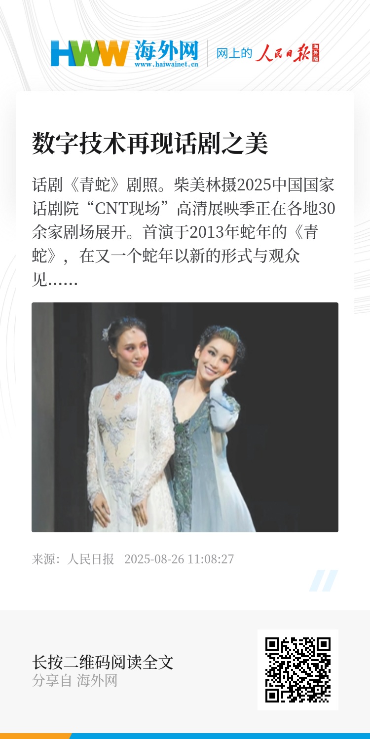 话剧《青蛇》自2013年香港艺术节首演后,曾在国内多个城市巡演,并受邀亮相美国肯尼迪艺术节、英国爱丁堡国际艺术节,以古典与现代元素交融之美,为中国故事的国际传播贡献戏剧艺术的力量。期待未来“CNT现场”能在海内外开枝散叶,让更多观众借助《青蛇》等作品的高清影像,领略中国戏剧、中国艺术的风采。(梅生)