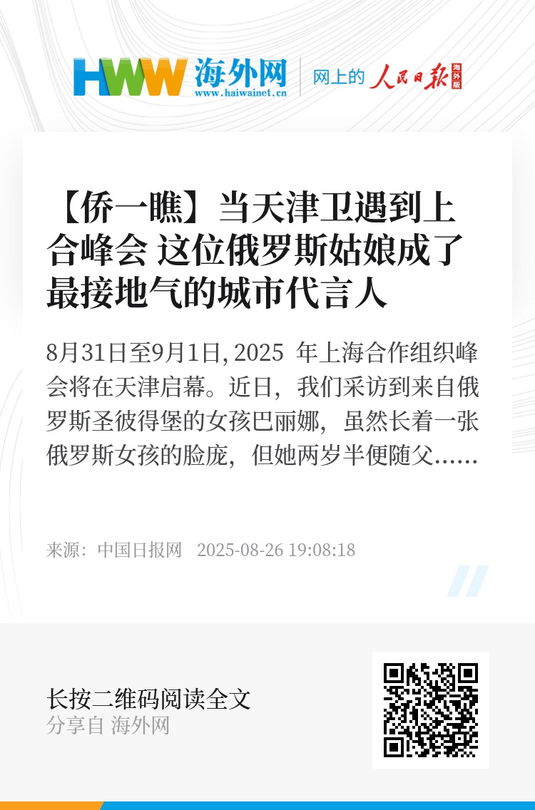 8月31日至9月1日,2025 年上海合作组织峰会将在天津启幕。近日,我们采访到来自俄罗斯圣彼得堡的女孩巴丽娜,虽然长着一张俄罗斯女孩的脸庞,但她两岁半便随父母定居津门,如今已成为地地道道的“天津闺女”。谈及即将在家门前举办的国际盛会,她满脸自豪:“欢迎全世界的朋友来天津,吃嘎巴菜、听相声,感受咱天津人的热情!”(记者:许聃 视频:潘一侨 审核:刘世东 王成孟)