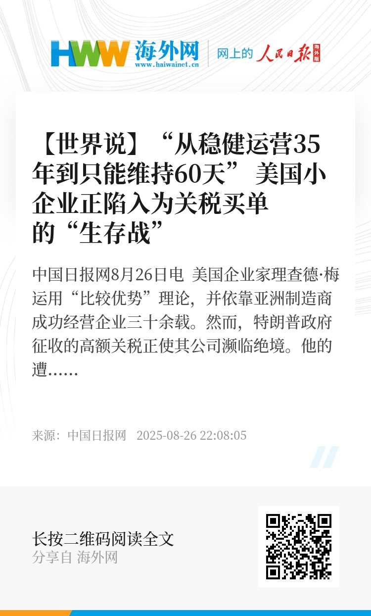 中国日报网8月26日电 美国企业家理查德·梅运用“比较优势”理论,并依靠亚洲制造商成功经营企业三十余载。然而,特朗普政府征收的高额关税正使其公司濒临绝境。他的遭遇并非个例,众多美国小企业正因关税成本激增而裁员、削减开支甚至倒闭,长期建立的全球供应链与商业关系面临严峻考验。