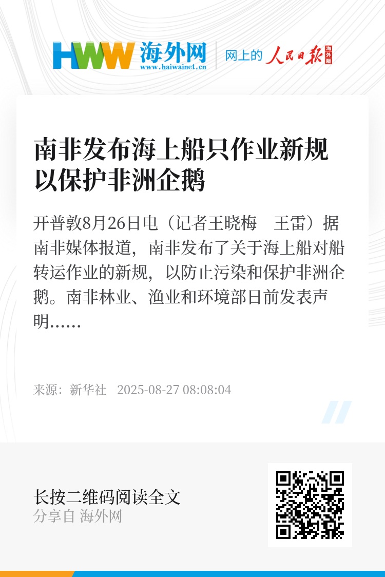 新华社开普敦8月26日电(记者王晓梅 王雷)据南非媒体报道,南非发布了关于海上船对船转运作业的新规,以防止污染和保护非洲企鹅。