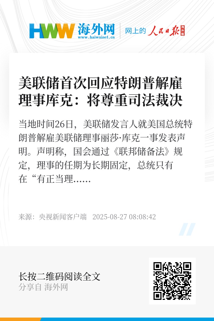 声明称,国会通过《联邦储备法》规定,理事的任期为长期固定,总统只有在“有正当理由”的情况下才能将其免职。理事的长期任期和免职保护是一项重要的保障,确保货币政策决策基于数据、经济分析和美国人民的长远利益。美联储将继续履行法律赋予的职责。