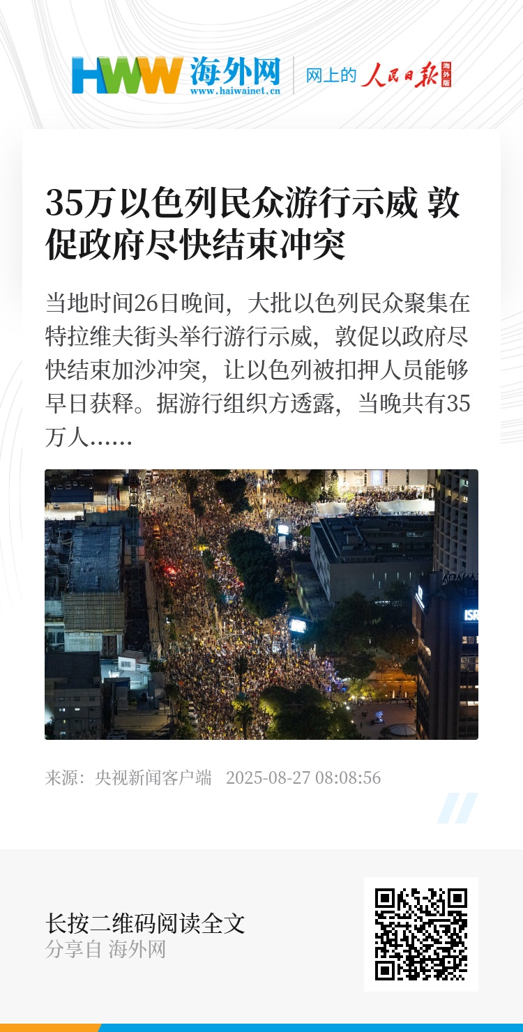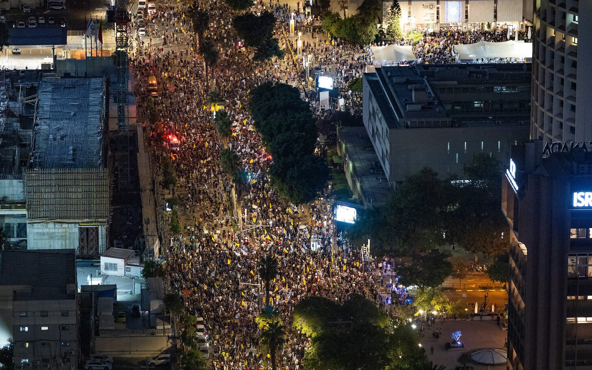 当地时间26日晚间,大批以色列民众聚集在特拉维夫街头举行游行示威,敦促以政府尽快结束加沙冲突,让以色列被扣押人员能够早日获释。