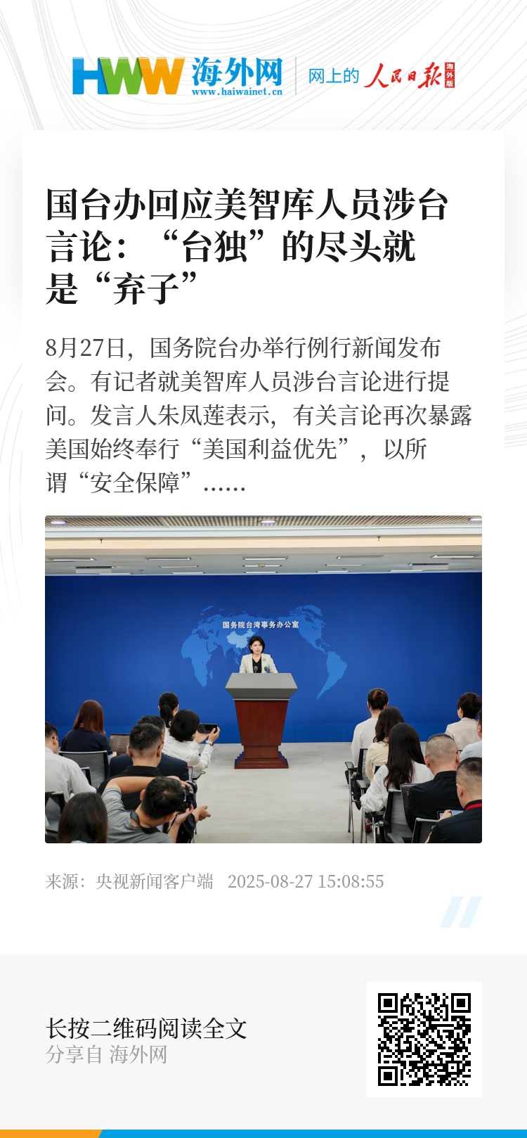 8月27日,国务院台办举行例行新闻发布会。有记者就美智库人员涉台言论进行提问。