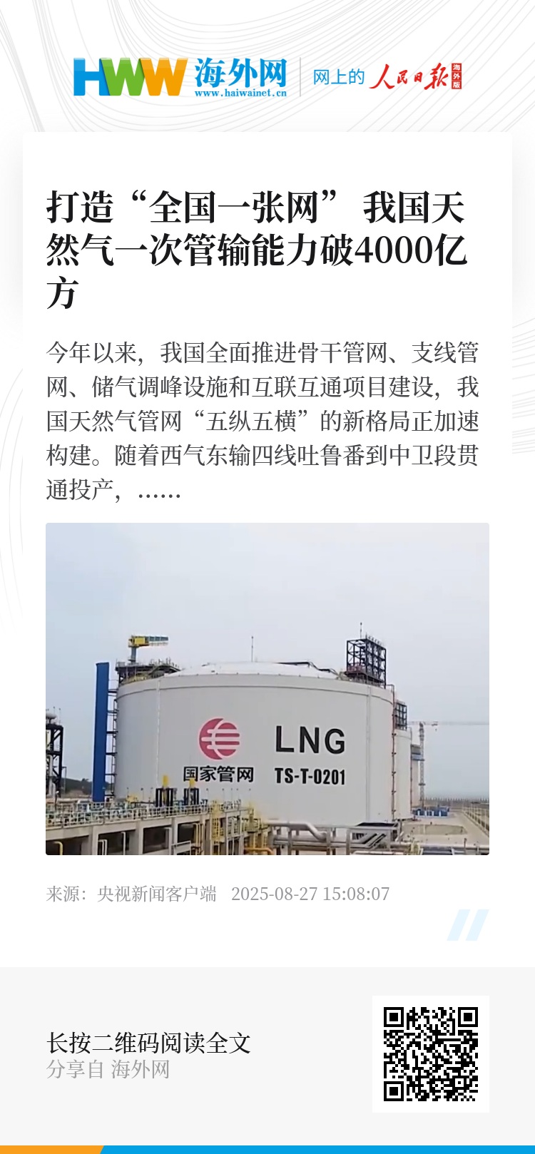 织网扩网步伐的加快,推动我国能源供应保障能力同步跃升。“十四五”以来,全国累计建成油气管道超1.3万公里,油气管道总里程已突破19万公里,“全国一张网”日供气能力提升到11.1亿立方米。目前,我国将基本形成横跨东西、纵贯南北、覆盖全国、联通海外的天然气“全国一张网”。