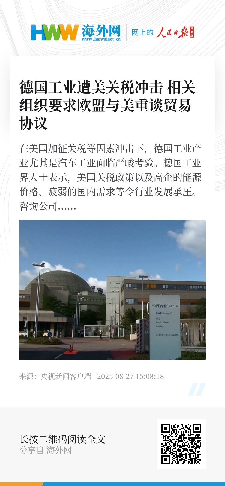德国机械设备制造业联合会主席卡夫拉特在26日公开的信件中,要求欧盟委员会主席冯德莱恩对欧盟与美国达成的贸易协议重新进行谈判。