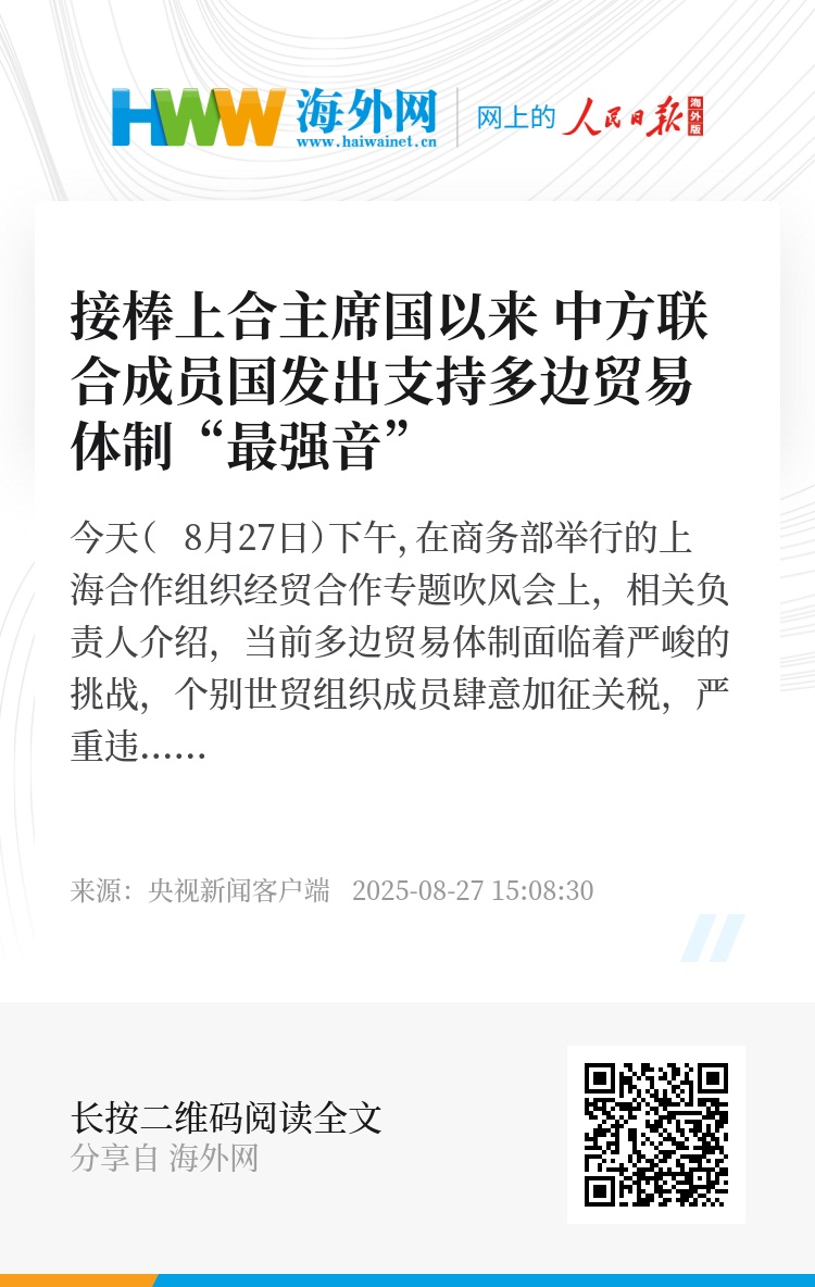 今天( 8月27日)下午,在商务部举行的上海合作组织经贸合作专题吹风会上,相关负责人介绍,当前多边贸易体制面临着严峻的挑战,个别世贸组织成员肆意加征关税,严重违反世贸组织规则,严重损害成员正当利益,严重扰乱国际经贸秩序,给全球的经贸发展蒙上了阴影。中方接棒2025年上合组织轮值主席国以来,积极联合上合组织成员国就应对全球贸易动荡,支持多边贸易体制发出最强的声音。今年4月,上合组织发表声明,重申坚定维护和加强多边贸易体制,有效应对贸易挑战,强调支持开放、包容、可持续、稳定、多元、可靠的全球供应链。