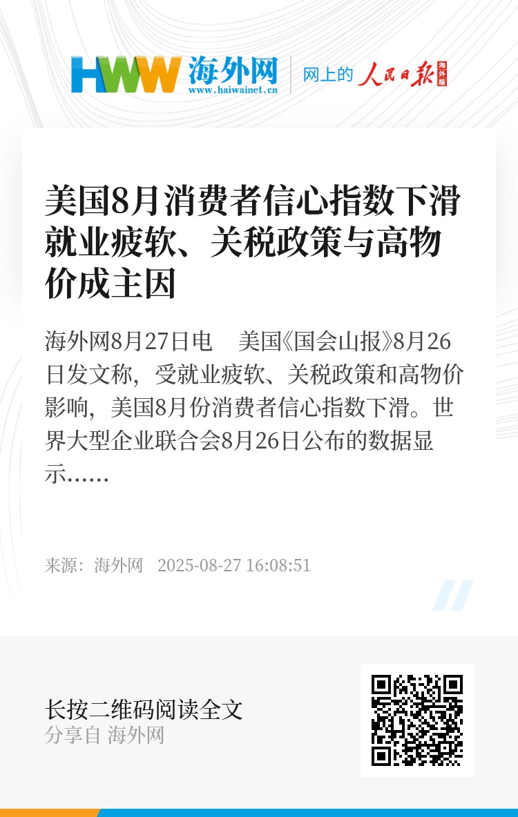 海外网8月27日电 美国《国会山报》8月26日发文称,受就业疲软、关税政策和高物价影响,美国8月份消费者信心指数下滑。