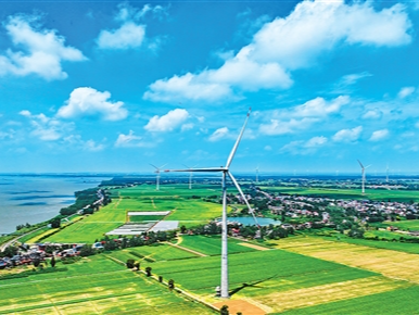江西省九江市彭泽县棉船镇,十余台风力发电机迎风旋转,与村庄、农田相映成趣,构成一幅风光旖旎、绿意盎然的江景画卷。朱海鹏摄(人民视觉)