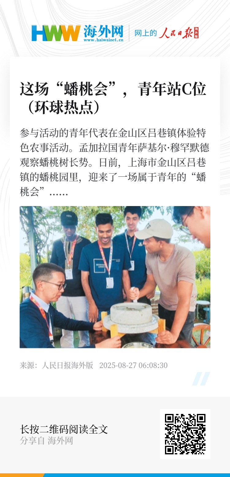 从一颗金山蟠桃出发,各国青年守护农耕智慧的行动仍在继续。据介绍,“青禾农遗行动:全球文化共栖”项目将继续走进韩国济州岛、老挝万象、意大利罗马等地,开展青年助力农业文化遗产创新相关交流。(本报记者 王慧琼文/图)