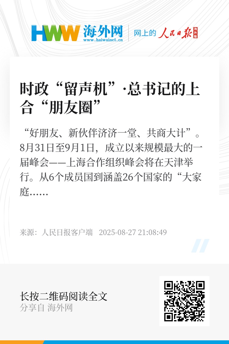 “好朋友、新伙伴济济一堂、共商大计”。8月31日至9月1日,成立以来规模最大的一届峰会——上海合作组织峰会将在天津举行。从6个成员国到涵盖26个国家的“大家庭”,从上合到“上合+”……海河之滨,习近平主席将同20多位外国领导人和10位国际组织负责人擘画发展蓝图、凝聚合作共识,为世界贡献更多“上合力量”。让我们一同期待:8月31日,天津见!