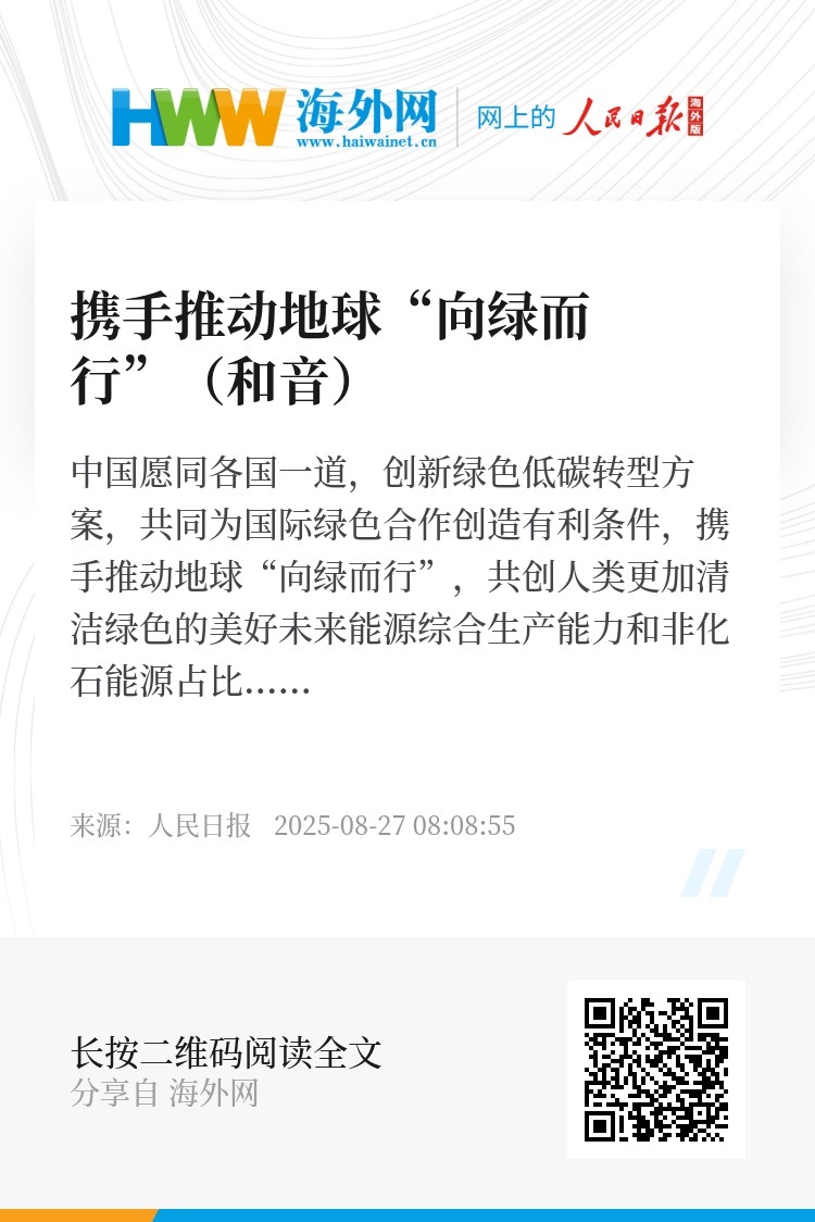 中国愿同各国一道,创新绿色低碳转型方案,共同为国际绿色合作创造有利条件,携手推动地球“向绿而行”,共创人类更加清洁绿色的美好未来