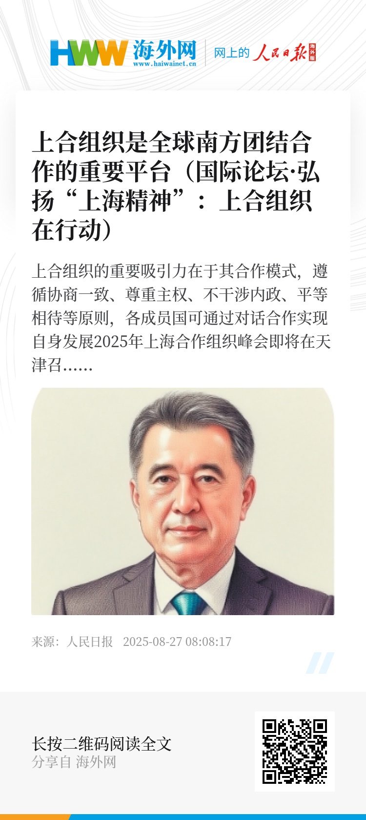 当今世界碎片化趋势加剧,国际秩序受到冲击。在此背景下,上合组织为应对全球化失衡、粮食和能源安全等挑战提供了有效方案,助力形成公平、包容的多极化国际秩序。上合组织的重要吸引力在于其合作模式,遵循协商一致、尊重主权、不干涉内政、平等相待等原则,各成员国可通过对话合作实现自身发展。上合组织正成为全球南方国家增强战略自主、实现可持续发展的重要平台。“上合组织+”模式为更多发展中国家提供了机遇,各方通过协同合作,在绿色经济、数字化、科技、教育等领域不断推出创新合作方案。