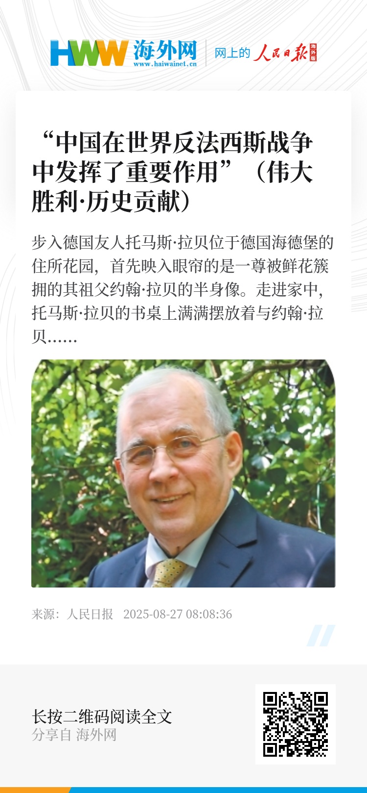 托马斯·拉贝正是从祖父的记录中,了解到中国人民抗日战争的历史。“中国在世界反法西斯战争中发挥了重要作用。”他说,中国是最早开始反抗法西斯侵略的国家,长期牵制和抗击日本军队的主要兵力,在削弱日本军国主义势力方面发挥了重要作用。在世界范围内,中国通过长期艰苦的抵抗为盟军胜利作出重大贡献。