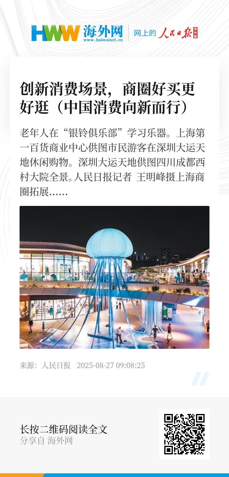 上海商圈拓展银发消费新场景,让老年群体爱上逛商场;广东深圳借力“赛演流量”,打造“公园式”商业街区,让逛商圈如同逛公园;四川成都建设“围合式”布局的商业综合体,满足不同年龄段消费者需求……多地积极探索构建消费新场景、推动业态交融,提供消费新体验,为提振消费提供有力支撑。