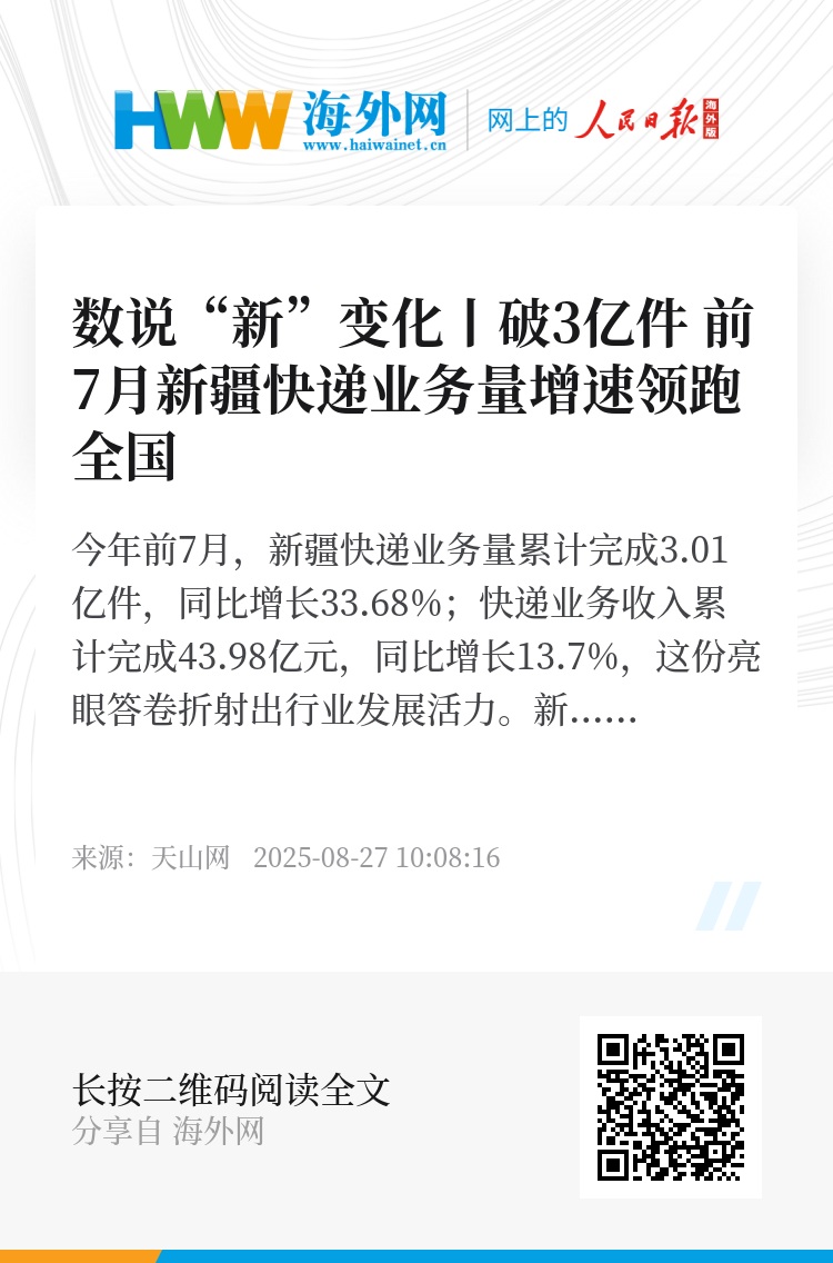今年前7月,新疆快递业务量累计完成3.01亿件,同比增长33.68%;快递业务收入累计完成43.98亿元,同比增长13.7%,这份亮眼答卷折射出行业发展活力。新疆快递业务中,各类业务发展情况如何?哪些地州表现突出?今天的《数说“新”变化》一起来看看。