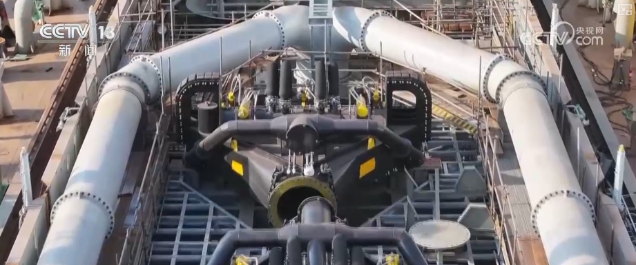 而藏在船舱里的我国自主研发的超大功率泥泵就像挖泥船的“心脏”,保障挖出的泥沙能高效抽吸到船上的泥舱内,并实现耙吸船12公里远距离泥沙吹排。“浚广”轮上首创的可调节双艏喷系统,就像两支巨大的高压喷枪,使泥沙喷排效率翻倍。