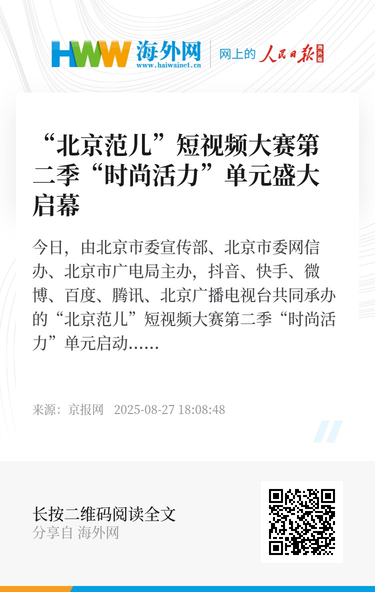 “北京范儿”短视频大赛自5月21日启动以来,第一季“古都新韵”单元,受到广泛关注,京内京外包括国际友人在内的多元创作主体踊跃参与,参赛作品数量及全网话题阅读量、讨论量远超预期。截至目前,累计征集作品超7.8万件,相关话题累计阅读量近45亿次,流量超100万的作品大批涌现,成就了一场全民记录北京、分享北京、传播北京的文化盛事。