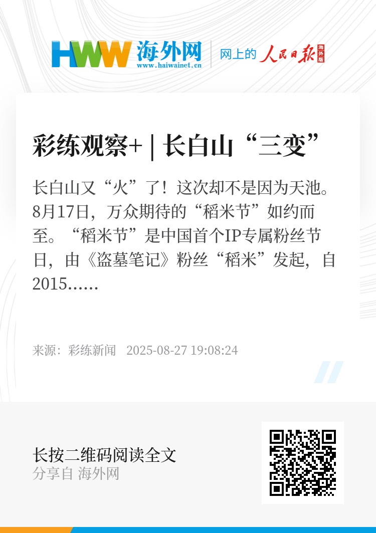 8月17日,万众期待的“稻米节”如约而至。“稻米节”是中国首个IP专属粉丝节日,由《盗墓笔记》粉丝“稻米”发起,自2015年起每年8月17日在长白山等地举办的纪念活动。当“青铜门”在天池脚下开启,当十万“稻米”奔赴二道白河小镇,长白山不再只是自然的象征,更成为年轻人心灵的归处。
